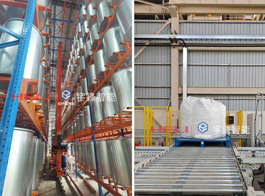 Overview: Addressing heavy, large‑volume, multi‑variety solid petrochemical materials, EFORK deployed two high‑density AS/RS units to automate the full cycle— inbound → storage → outbound → dispatch. Through space‑optimized design, automated stacking and efficient scheduling algorithms, the system breaks site limitations, increases storage density by ~12× and substantially cuts operating costs, enabling lean management and capacity release.